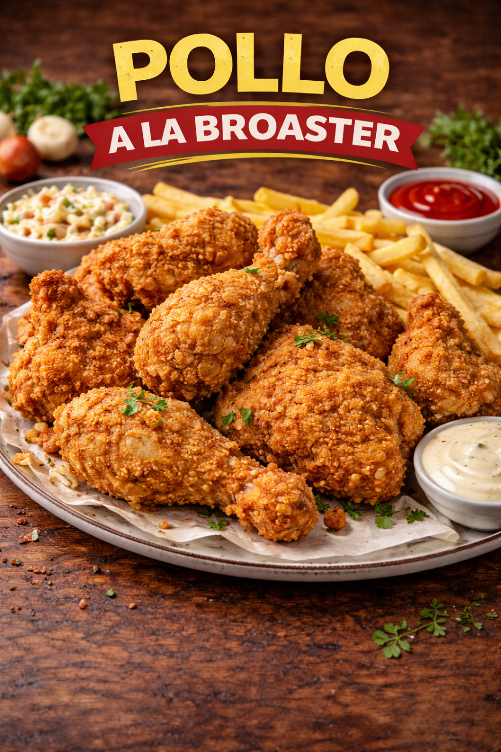 Delicioso 1/2 Pollo Broaster con papa salada, salsas y arepa.